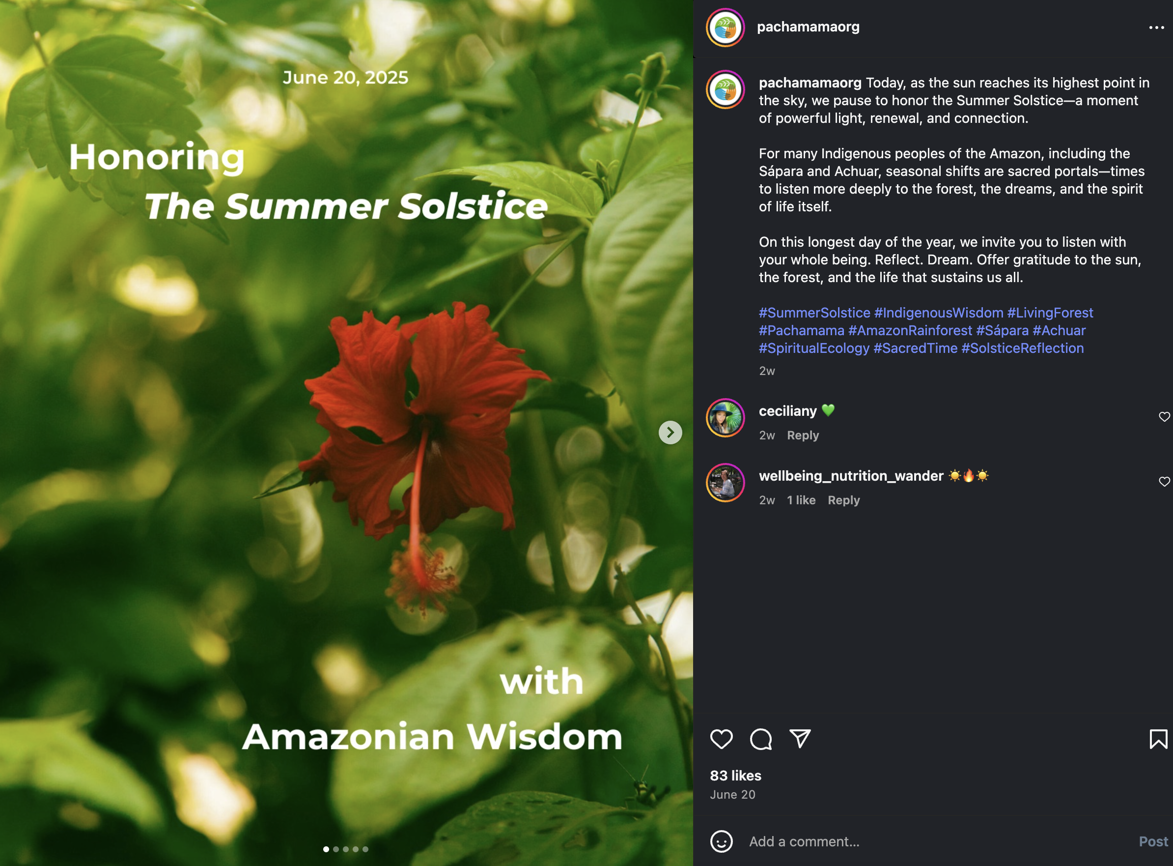 Pachamama Alliance Social Channels Created original social content and managed Instagram, Facebook, LinkedIn, X and Youtube from August 2024 to present.Browse through some top performing organic social posts below! Click the image to view the carousel post!